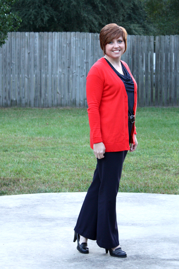 I was inspired by Juggling Chic's rust and navy combo to put this outfit together. I created my outfit with slacks vs jeans for a work outfit. I really love my navy polka dot top and have not began to exhaust the ways I can wear it.