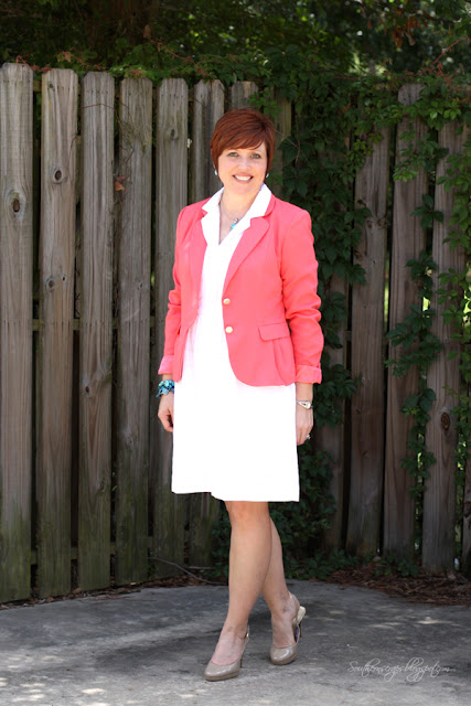 Hello and Happy Monday. Last year, I invested in a coral blazer. Coral is always a popular spring and summer color, and can be carried into fall with the right pieces. Here are four ways I've worn my coral blazer. (I've got other ways in mind- navy, mint- I'm sure I'll come up with more.)